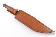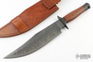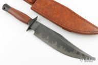 This Bowie by Giedymin  Kapuscinski's Big Blades features a dark hand rub satin finished finished blade with nice hamon and false top edge, .259" blade stock and 2.223" blade depth, hidden tang construction. The handle has a darkened steel guard and butt with brown canvas micarta grip. Comes with a brown leather sheath and zippered case. Has some oxidation on the butt, otherwise excellent condition.