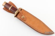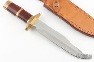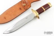 This knife by John Nelson Cooper features a satin finished blade with a nearly sharpened top edge, .170" blade stock and 1.458" blade depth, hidden tang construction. The handle has a brass guard and butt, maroon linen micarta grip with brass spacers. Has some light scratches, otherwise excellent condition. Comes with a zippered case and brown leather sheath.