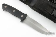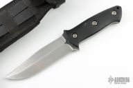 This knife by Kapuscinski Giedymin's Big Blades features a hand rub satin finished blade with forge finish flats and sharpened top edge, .234" blade stock and 1.393" blade depth, full tapered tang construction. The handle has black paper micarta scales. Coems with a nylon sheath with leg strap and a zippered case. Has a couple light scratches, and the very tip is bent, otherwise good condition.