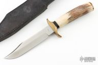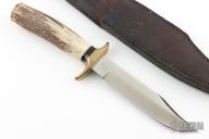 This Small Fighter by GW Stone features a satin finished clip point blade with a sharpened top edge, .190" blade stock and .981" blade depth, hidden tang construction. The handle has a brass double guard and brass butt cap, stag grip with black and brass spacers. Has some light patina, otherwise excellent condition. Comes with a zippered and black leather sheath.