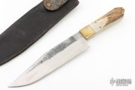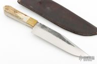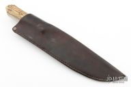 This knife (Please let us know who this maker is) features a two-tone blade with false top edge, .233" blade stock and 1.711" blade depth, full tang construction. The handle has brass bolsters, stag scales and brass pins. Comes with a brown leather sheath and zippered case. Excellent condition.