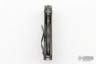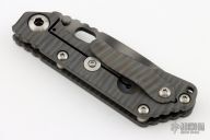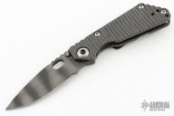 This JVA by Mick Strider is larger than a PT, but smaller than an SNG. It features a tiger striped blade with notched thumbrest and thumbhole. The handle has a flame finished titanium frame with matching tip up clip. New from Maker.