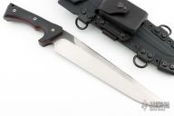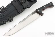 This Custom M-21 by Miller Bros Blades features a hand rub satin finished clip point blade with a sharpened top edge and notched thumbrest, .322" blade stock 2.256" blade depth, full tang construction. The handle has black/red G-10 scales with notched tang, lanyard hole. Comes with a kydex/leather sheath with extra pocket that can hold survival items. Comes with COA dated 2023. New from maker.