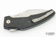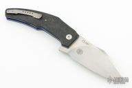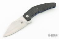 This Tashi Bharucha designed flipper by Andre Thorburn and Andre van Heerden features a spear point hand rub satin finish blade with a false top edge, notched thumbrest and flipper. The handle is comprised of marble carbon fiber scales, anodized titanium liners, tip up clip. Includes velcro case and COA dated May 2018. Nice detent, lock up and blade seating. Excellent Condition.