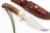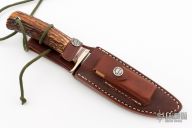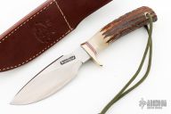 The Model 11 is the original drop-point blade. Designed by Tommy Thompson, noted Alaskan guide, in 1952 for big-game skinning, with point dropped below top of blade to prevent cutting too deeply through skins when used point first. The blade is satin finished with a notched thumbrest, .224" blade stock and 1.437" blade depth, hidden tang construction. The handle has a nickel silver guard, stag handle, red/white/blue spacers, lanyard hole in the butt. Comes with a brown leather sheath with sharpening stone. Excellent condition.