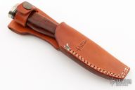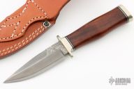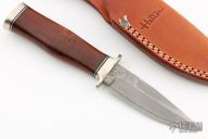 Thsi KD30 Hunter was hand made by Ichiro Hattori, it features a Cowry-X blade with false top edge, .194" blade stock and .967" blade depth, hidden tang construction. The handle has a nickel silver guard and butt with cocobolo grip and black/nickel silver spacers. Comes with a brown leather sheath. Has a couple light scratches, otherwise excellent condition.