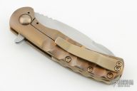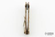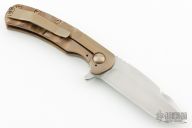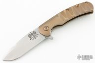 This Designated Marksman flipper by Doc Shiffer features a hand rub satin finished drop point blade with flipper tab. The handle has an anodized and satin finished titanium frame with matching backspacer and tip up clip. Nice blade seating, detent and lockup. Comes with zipper case and COA. Has a couple light scratches on the clip, excellent condition otherwise.