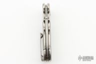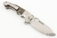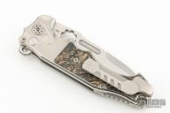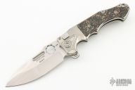 This Pitboss 2 by Andre De Villiers features a bead blast finish blade with thumbhole, notched thumbrest and flipper. It swings smoothly on a ball-bearing system and has both a thumb hole and flipper opener; it can also be opened or closed with a flick of the wrist when the inlaid button lock is held down. A safety switch on the side allows the blade to be locked in the closed position or provides an additional level of safety in the open position. It has a satin titanium frame and marble carbon fiber inlays. A jimped, titanium backstrap with a lanyard hole and a tip-up, titanium pocket clip with hidden screws. "15-2021" on the ricasso. Comes with a zipper case. Has a couple light scuffs otherwise excellent condition.