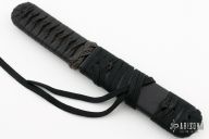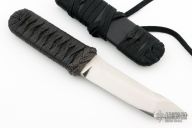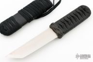 This Strongboy by Phill Hartsfield has a chisel ground tanto blade with a swedge and a epoxied black cord wrapped handle, .248" stock and 1.233" depth, hidden tang construction. Comes with paper lined, leather covered metal sheath. Fine example of Phill Sr.'s work. Excellent condition.
