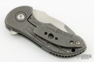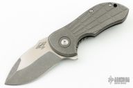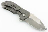 This Production Gordo flipper by Peter Carey features a two-tone blade with notched thumbrest and flipper. The handle has a tumbled and tread milled titanium frame with matching tip up clip and backspacer. Caged bearings. Nice detent, lockup and blade seating. Comes with zipper case. Excellent condition.