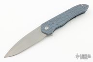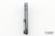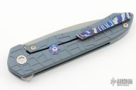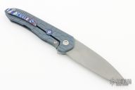 This Servo by Brown Knives features a tumbled drop point blade and flipper. The handle has an anodized and milled titanium frame, mokuti backspacer, over travel stop and tip up clip with hidden screws. Nice detent, blade seating and lock up. Rides on bearings. Comes with original hard case with COA. Excellent condition.