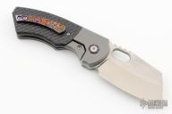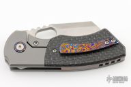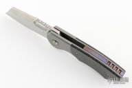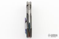 This Production Slim by Berg Blades features a satin finished blade with notched thumbrest and thumbhole. The handle has a bead blast finish titanium frame with timascus titanium backspace, pivot collars and tip up clip. Comes with original box, zipper case, original carbon fiber pivot collars and titanium clip. Nice detent, lockup and blade seating. Has some light scuffs on the frame, otherwise excellent condition.