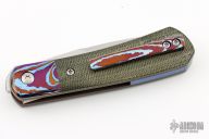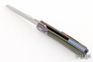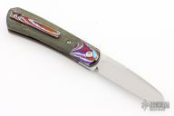 This Apache Front Flipper by Enrique Pena features a hand rub satin finished blade with notched thumbrest/front flipper. The handle has mokuti bolsters, green canvas micarta scales, bead blasted and anodized titanium liners, anodized titanium backspacer, tip up mokuti clip. Comes with a zipper case. Has a couple light scratches, otherwise excellent condition.