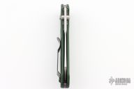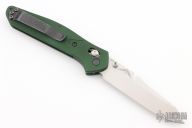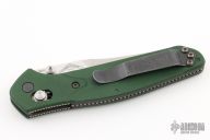 This Benchmade Osborne 940 features a tumble finished clip point blade with swedge and dual thumb studs. The handle is comprised of a machined and green anodized aluminum frame over jimped and purple anodized titanium backspacer. The black coated, steel tip up clip is reversible for right or left hand carry. Has a couple light scuffs, otherwise excellent condition. Comes with original box and papers.