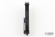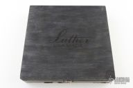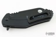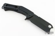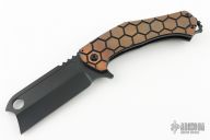 This Orphan by Eric Luther features a Black Cerakote coated blade with satin flats, milled fullers, hole in blade, notched thumbrest, flipper. The handle has a Copper show side with custom hex milling and black Cerakote, matching titanium backspacer with lanyard hole, black coated tip up titanium clip. Comes with wood display box, and COA dated 02/07/17. Excellent Condition.