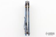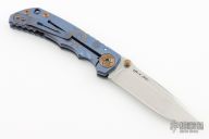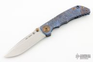 This Harsey framelock folder by Spartan Blades features a stonewashed drop point S45VN blade with dual thumbstuds and a notched thumbrest. The handle has an anodized titanium frame with a laser engraving a tip up titanium clip and filler tab. Has nice detent, lockup, and blade seating. Comes with original box. Excellent condition.