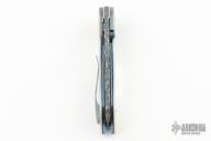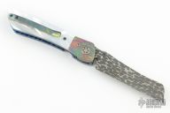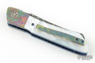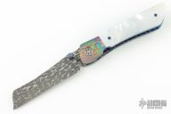 This linerlock folder by KC Gray features a Damascus blade with single thumbstud. The handle has an orange peel and anodized finish titanium frame, with jeweled interior, MOP scales, Black Timascus bolsters and tip up clip. Rides on bearings, nice detent, lockup and blade seating. Comes with COA dated 10-20-20. Comes with zippered case. Has a couple light scuffs, excellent condition otherwise.