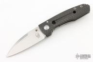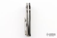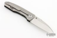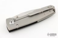 This EDMW framelock folder from Steve Karroll features a satin finished blade with dual thumbstuds. The handle has a carbon fiber and tumbled titanium frame and a titanium clip positioned for tip up carry. Nice detent, lockup and blade seating. Blade pivots on caged bearings. Has some light scratches, otherwise excellent condition. Comes with a zippered case.