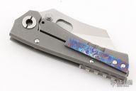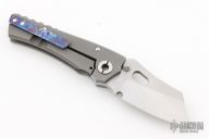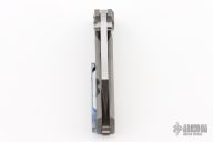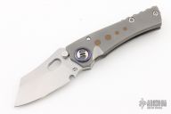 This Diomedes framelock features a satin finished blade with thumbrest and thumbhole. The handle has a bead blast finish titanium frame with notched titanium backspacer, Mokuti pivot collars and tip up clip. Copper inserts on the show side. Comes with original box, and COA dated 10/17. Nice detent, lockup and blade seating. Has some light scuffs on the frame, otherwise excellent condition.