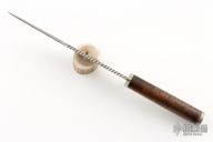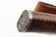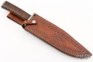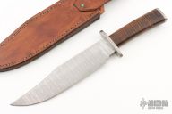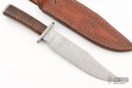 This custom bowie by Master Smith Donald Lange has a Damascus clip point blade with fileworked spine and false top edge, .188" blade stock and 1.819" depth, hidden tang construction. Handle has a Damascus guard and butt, tiger maple grip. Comes with a hand tooled brown leather sheath and a zippered case. Has a couple light scratches, otheriwse excellent condition.