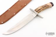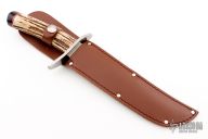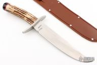 This fighter has a makers mark that looks like a hammer and sickle, please let us know if you know who this is. It features a hand rub satin finished blade with false top edge, .150" blade stock and 1.415" blade depth, hidden tang construction. The handle has a stainless steel guard, stag grip with buffalo horn butt, red and stainless steel spacers. Comes with a brown leather sheath and a zippered case. Excellent condition. Stamped 031907