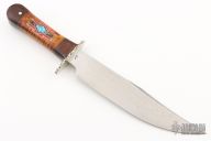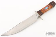 This Bowie by Master Smith Jay Hendrickson features a Damascus blade with a false top edge, hidden tang construction with .186" blade stock and 1.646" blade depth. The handle has a nickel silver guard with filework, curly maple handle with desert ironwood burl butt and spacer, silver wire and turquoise inlays. Includes a zippered case. Excellent condition.