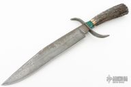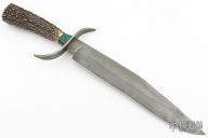 This Bowie by Keith Bagley has a Damascus blade with a nice temper line and a false top edge, .196" blade stock and 1.707" blade depth, hidden tang construction. The handle has a Damascus guard and butt with a stag grip with a malachite spacer. Excellent condition. Comes with a zippered case.