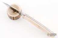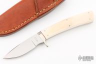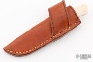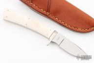 This Fixed Blade from Andy Mills features a mirror polished drop point blade with fileworked thumbrest. The handle has a nickel silver guard and mammoth ivory scales with dark red liners and full tang construction. Includes leather sheath with belt loop. Excellent condition.
