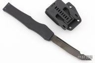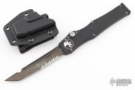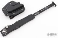 This Halo V by Microtech Knives features a black stonewash finished partially serrated blade with fullers. The handle has a black aluminum frame and bead blast finished titanium charging handle. Comes with original kyxed sheath, box and papers. Dated 08/2014 and s/n 06958. Has some light scuffs, otherwise excellent condition.