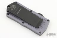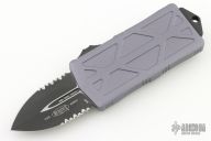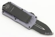 This Microtech Exocet features a black finished double-edged partially serrated blade. The handle has a gray aluminum handle and a black finished stainless clip that doubles as a money clip dated 07/2020 s/n 10926. Comes with original box and papers. Excellent condition.