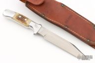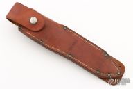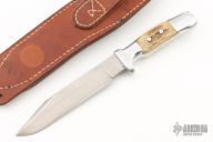 This Model 25AC Custom Workman by Ruana knives features a satin finished clip point blade with sharpened top edge, .171" blade stock and 1.109" blade depth, hidden tang construction. The handle is cast from aluminum with elk horn inserts. Comes with a brown leather sheath.  Has some light scratches, otherwise good condition.