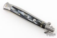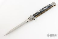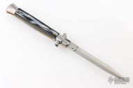 This 11" Swivel Bolster features a polished dagger blade. The handle has stainless steel bolsters, front and rear, synthetic horn scales, brass liners, stainless spring. Excellent Condition.