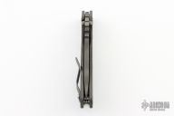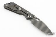 This Mick Strider Performance Series SMF framelock folder features a black finished spear point blade with thumbhole and notched thumbrest. The handle has a flamed titanium frame with titanium clip, tip up carry. Jimping on blade spine. Includes Hinderer "Lock Bar Stabilizer" for maximum reverse lock retention. Nice detent, lockup and blade seating. New from maker at the 2023 CCKS.