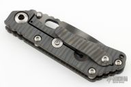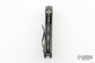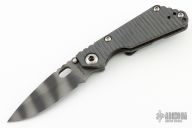 This JVA by Mick Strider is larger than a PT, but smaller than an SNG. It features a tiger striped blade with notched thumbrest and thumbhole. The handle has a flame finished titanium frame with matching tip up clip. New from Maker at the 2023 CCKS.