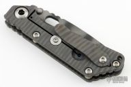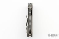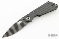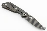 This JVA by Mick Strider is larger than a PT, but smaller than an SNG. It features a tiger striped blade with notched thumbrest and thumbhole. The handle has a flame finished titanium frame with matching tip up clip. New from Maker at the 2023 CCKS.