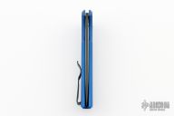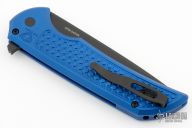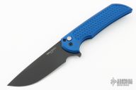 This Mordax by Pro-Tech is a Ferrum Forge design and features a black drop point blade. The handle has milled a blue aluminum frame with black tip up stainless steel clip. Black Lip Pearl inlaid push button. Comes with original box and papers. New from maker!