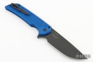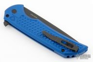 This Mordax by Pro-Tech is a Ferrum Forge design and features a black drop point blade. The handle has milled a blue aluminum frame with black tip up stainless steel clip. Black Lip Pearl inlaid push button. Comes with original box and papers. New from maker!