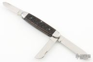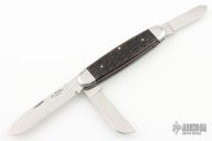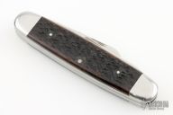 This knife by AC Warren features 3 hand rub satin finished blades with nail nicks. The handle has dovetailed stainless steel bolsters, jigged bone covers, stainless steel liners and springs. Has half-stops. Has some scratches, otherwise good condition.