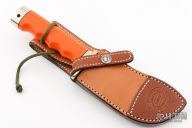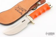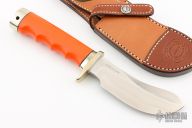 This Rick Bowles skinner by Randall has a satin finished blade with false top edge, .238" blade stock and 1.700" blade depth, notched thumbrest, hidden tang construction. The knife carries the small Randall logo stamp and the backside is etched with "Bowles 514". The handle has a nickel silver guard and butt with lanyard hole, finger groove orange G-10 grip, black spacers. Comes with brown leather sheath and a zippered case. Excellent condition.