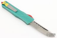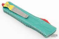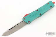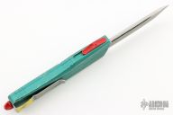 This Combat Troodon Bounty Hunter by Microtech Knives features a tanto blade with fullers, satin flats and apocalyptic finished grinds. The handle has a green battle worn aluminum handle with red hardware, tip down apocalyptic finished stainless steel clip. Dated 06/2022, s/n 2100.  Excellent condition. Comes with orignal box and papers.