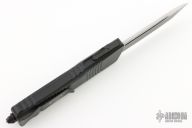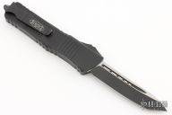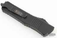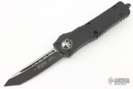 This Combat Troodon OTF automatic by Microtech knives features a black tanto blade, and a black aluminum handle with black hardware, tip down carry. Glass breaker. S/N 36105. Dated 11/2021. Comes with original box and papers. Has a couple light scuffs, otherwise excellent condition.