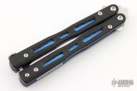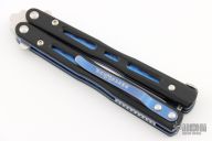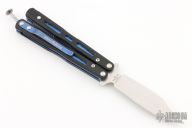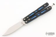 This Model 32 Morpho Balisong by Benchmade has a stonewashed spear point D2 stainless steel blade. Handle is black G-10 with blue anodized titanium liners and milled stainless steel spacers. Blue anodized titanium tip up clip. Excellent condition. Comes with original box and papers.