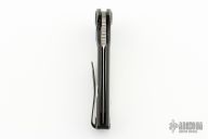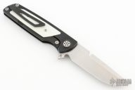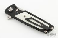This Micro Typhoon flipper from Brian Nadeau/Sharp by Design features a satin finished blade with swedge. The handle features black tumbled titanium scales with white G-10 inlays. Matching titanium pocket clip and backspacer. Blade is centered when closed, flips well with no wrist action needed, and locks up with no play. Excellent condition. Comes with vaulted case.