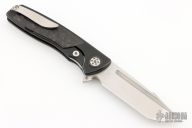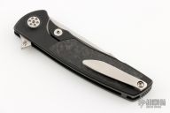 This Micro Evo from Brian Nadeau features a satin finished harpoon blade with a fuller and notched thumbrest. The handle has a black PVD titanium frame with marble carbon fiber inlays, satin titanium tip up clip. Rides on bearings, nice detent, lockup and blade seating, stainless lockface insert. Comes with original box. Has a couple light scratches otherwise excellent condition.
