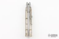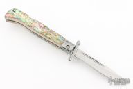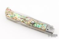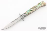 This Swing Guard Lockback Auto by AKC Italy has a polished blade with fullers. The handle has Abalone on translucent resin scales with stainless steel bolsters, stainless steel liners, and stainless steel back spacer and lock.  Includes the original box. Excellent Condition.