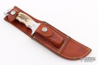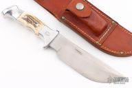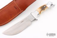 This Model 20A Skinner by Rudy Ruana features a satin finished blade with false top edge and notched thumbrest, .170" blade stock and 1.704" blade depth, hidden tang construction. The handle is cast from aluminum with elk inserts. Blade is signed RH Ruana. Comes with brown leather sheath. Has some light scratches, otherwise excellent condition.