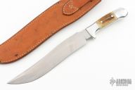 This Custom Finn made by Rudy Ruana features a satin finished recurve blade with false top edge and notched thumbrest, .189" blade stock and 1.475" blade depth, hidden tang construction. The handle is cast aluminum with elk inlays. Comes with brown leather sheath. Has light scratches, otherwise good condition.