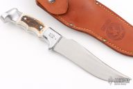 This Custom Finn made by Rudy Ruana features a satin finished recurve blade with false top edge and notched thumbrest, .189" blade stock and 1.445" blade depth, hidden tang construction. The handle is cast aluminum with elk inlays. Comes with brown leather sheath. Has scratches, otherwise good condition.