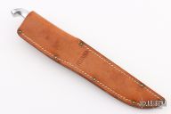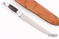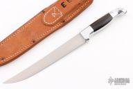 This Custom Fillet by Ruana knives features a satin finished blade with .069" blade stock and .909" blade depth, hidden tang construction. The handle is cast from aluminum with ironwood inserts. Comes with brown leather sheath. Excellent condition.