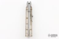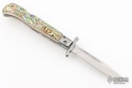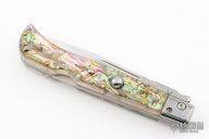 This Swing Guard Lockback Auto by AKC Italy has a polished blade with fullers. The handle has Abalone on translucent resin scales with stainless steel bolsters, stainless steel liners, and stainless steel back spacer and lock.  Includes the original box. Excellent Condition.